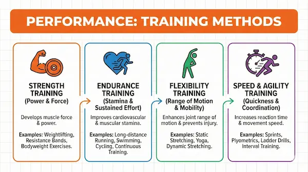 Effective physical performance relies on a balanced mix of strength, endurance, flexibility, and agility training tailored to individual goals